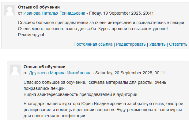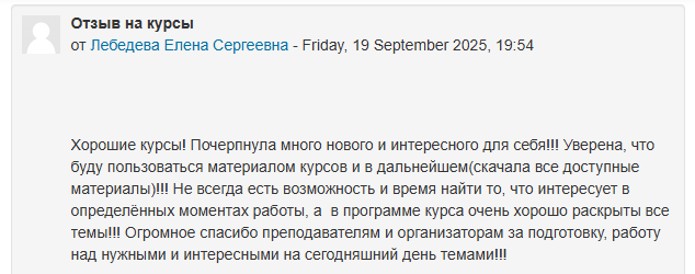Все слушатели успешно завершили обучение. По результатам проведенного опроса 96% слушателей оценивают уровень практической значимости изученного курса для профессиональной деятельности как высокий. Абсолютно все респонденты отмечают полное соответствие содержания программы заявленной тематике.