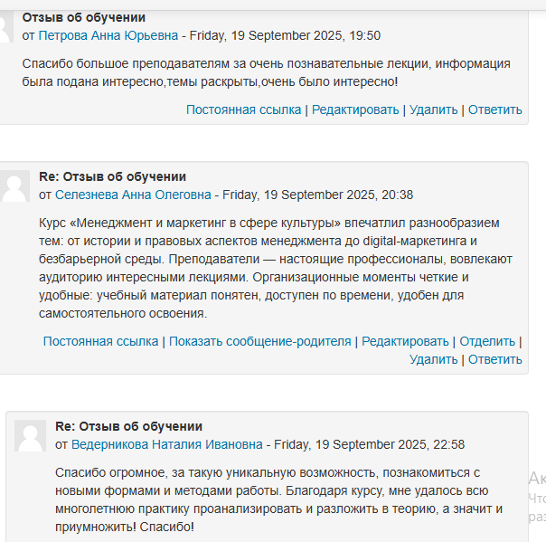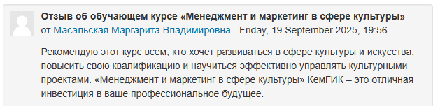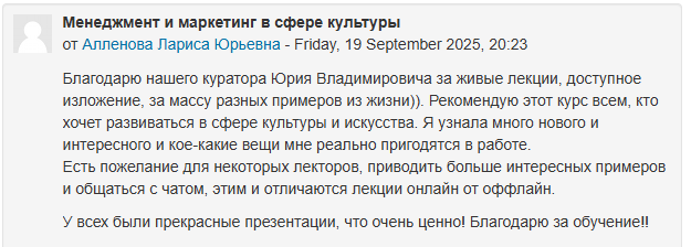 В рамках реализации Национального проекта «Культура» Федерального проекта «Развитие культуры» в период с 08 по 19 сентября 2025 г. прошло обучение по дополнительной профессиональной программе повышения квалификации «Менеджмент и маркетинг в сфере культуры».