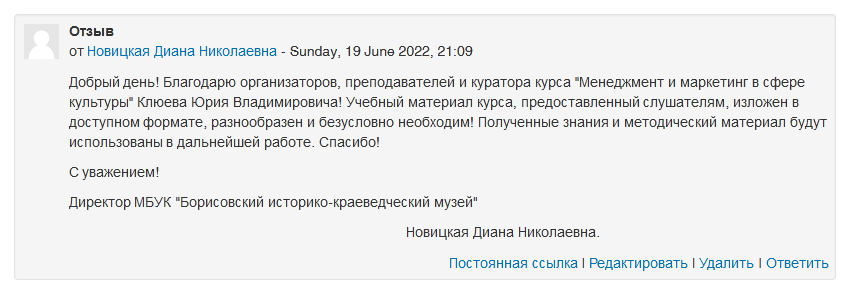 В рамках реализации федерального проекта «Творческие люди» Национального проекта «Культура» с 06 июня по 20 июня 2022 г. в очном формате с применением дистанционных технологий прошли обучение 69 человек из 23 субъектов Российской Федерации прошли курсы повышения квалификации по программе «Менеджмент и маркетинг в сфере культуры».