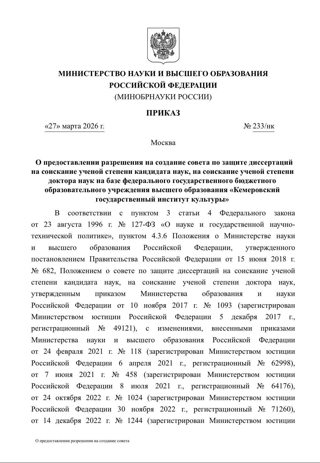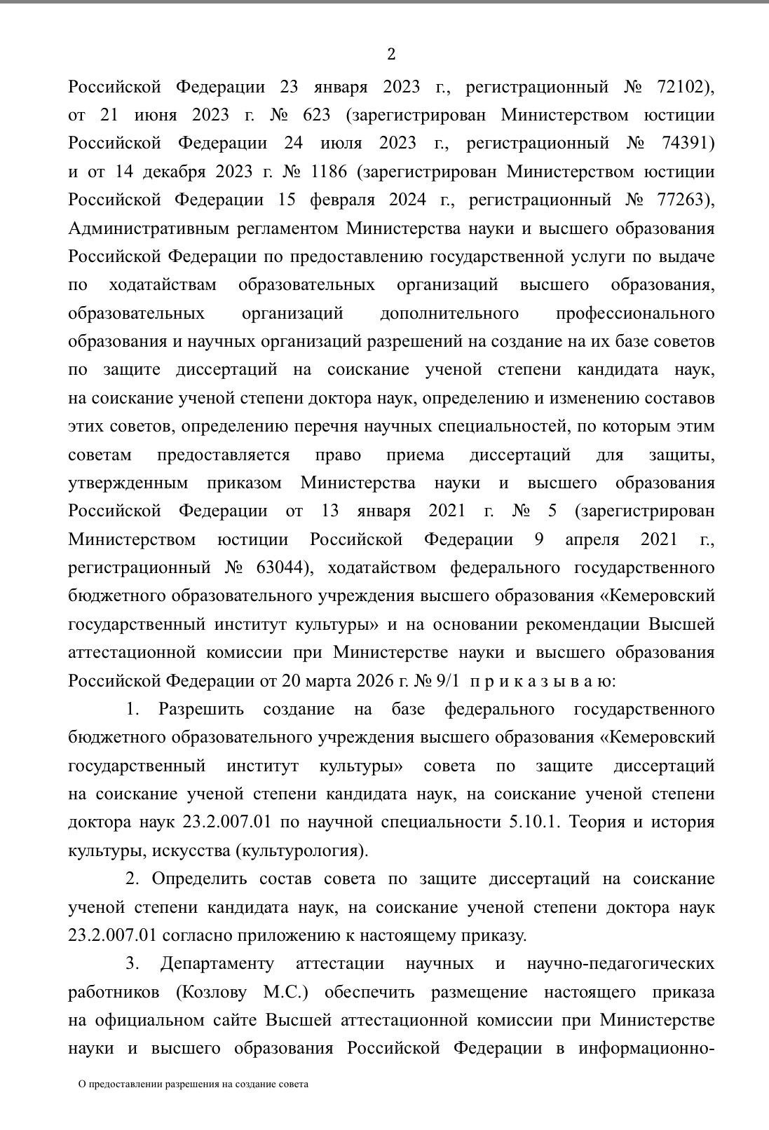 Министерство науки и высшего образования Российской Федерации опубликовало приказ «О предоставлении разрешения на создание совета по защите диссертаций на соискание ученой степени кандидата наук, на соискание ученой степени доктора наук на базе федерального государственного бюджетного образовательного учреждения высшего образования “Кемеровский государственный институт культуры”», открывающий новый этап в развитии научной деятельности КемГИК: научной экспертизы диссертационных исследований, представляемых в совет к защите, и развитие научной школы вуза. Документом, подписанным в соответствии с установленным порядком, вузу предоставлено разрешение на создание совета по защите диссертаций на соискание ученой степени кандидата и доктора наук.