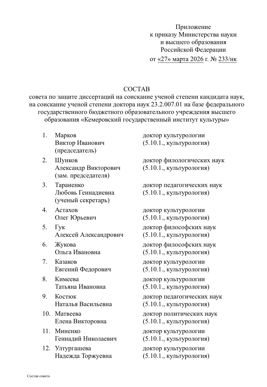 В компетенцию созданного диссертационного совета 23.2.007.01 входит проведение защит по научной специальности 5.10.1 – Теория и история культуры, искусства (культурология). Данное направление является ключевым для подготовки научно-педагогических кадров высшей квалификации в сфере культуры.
